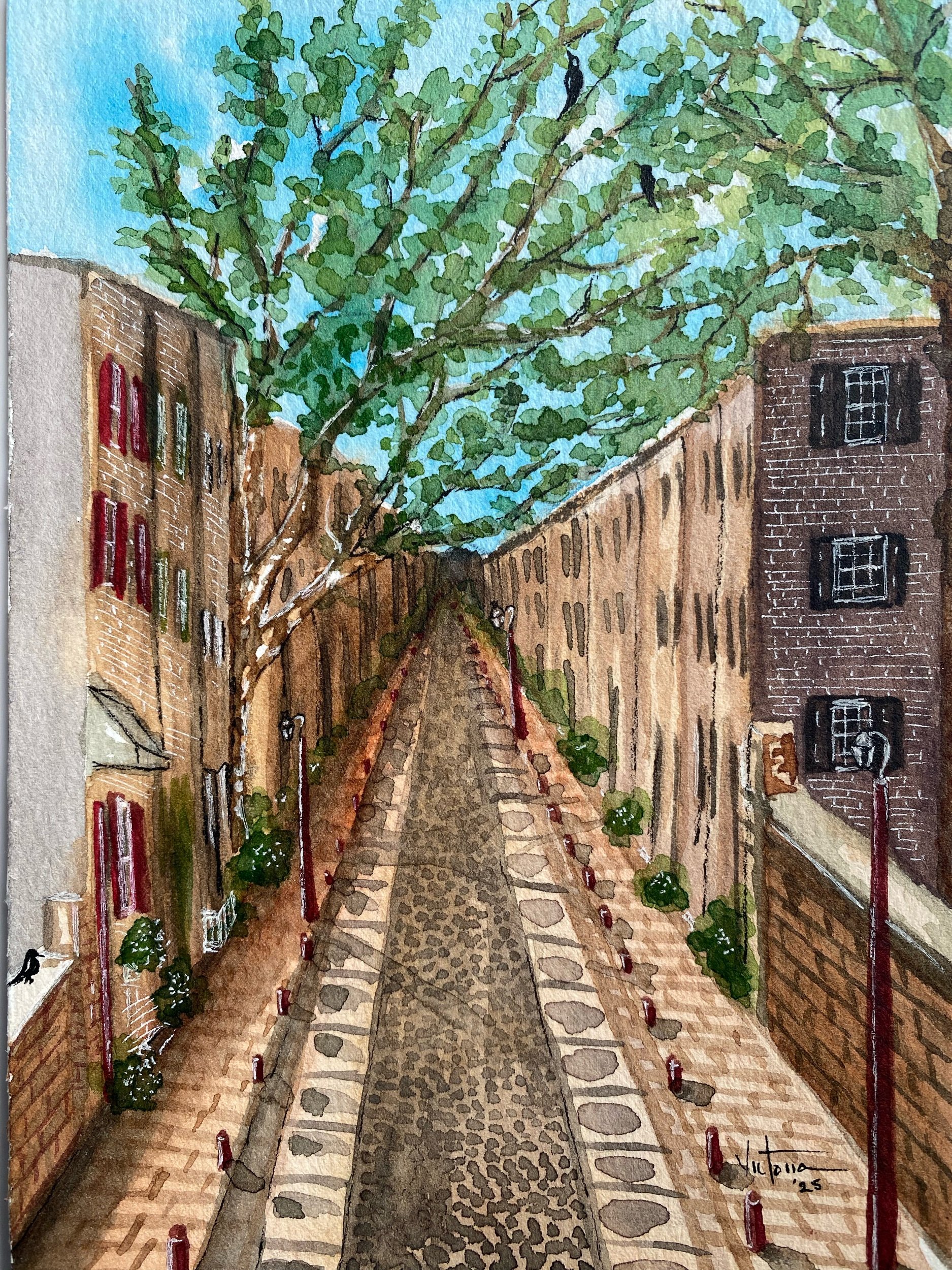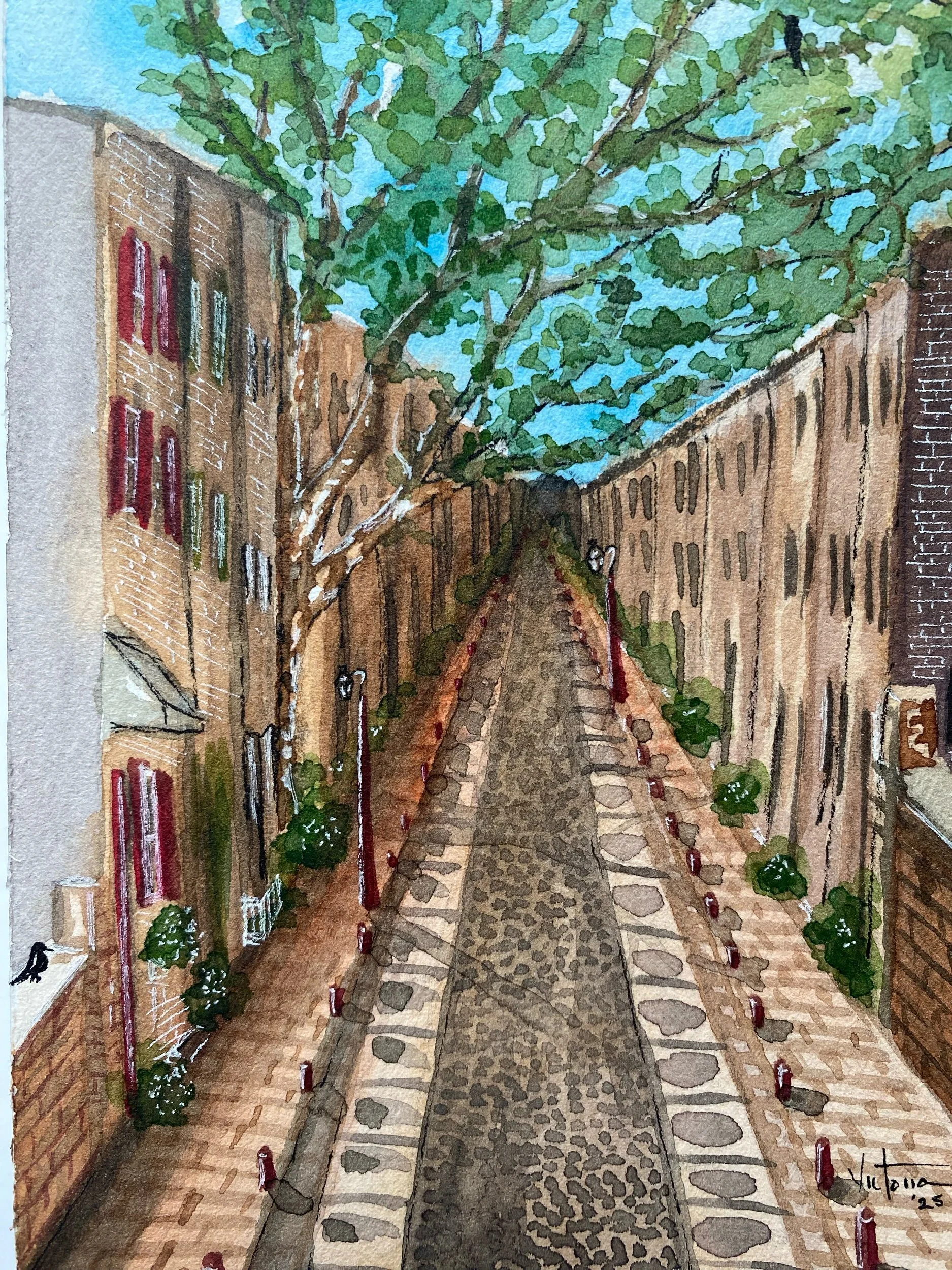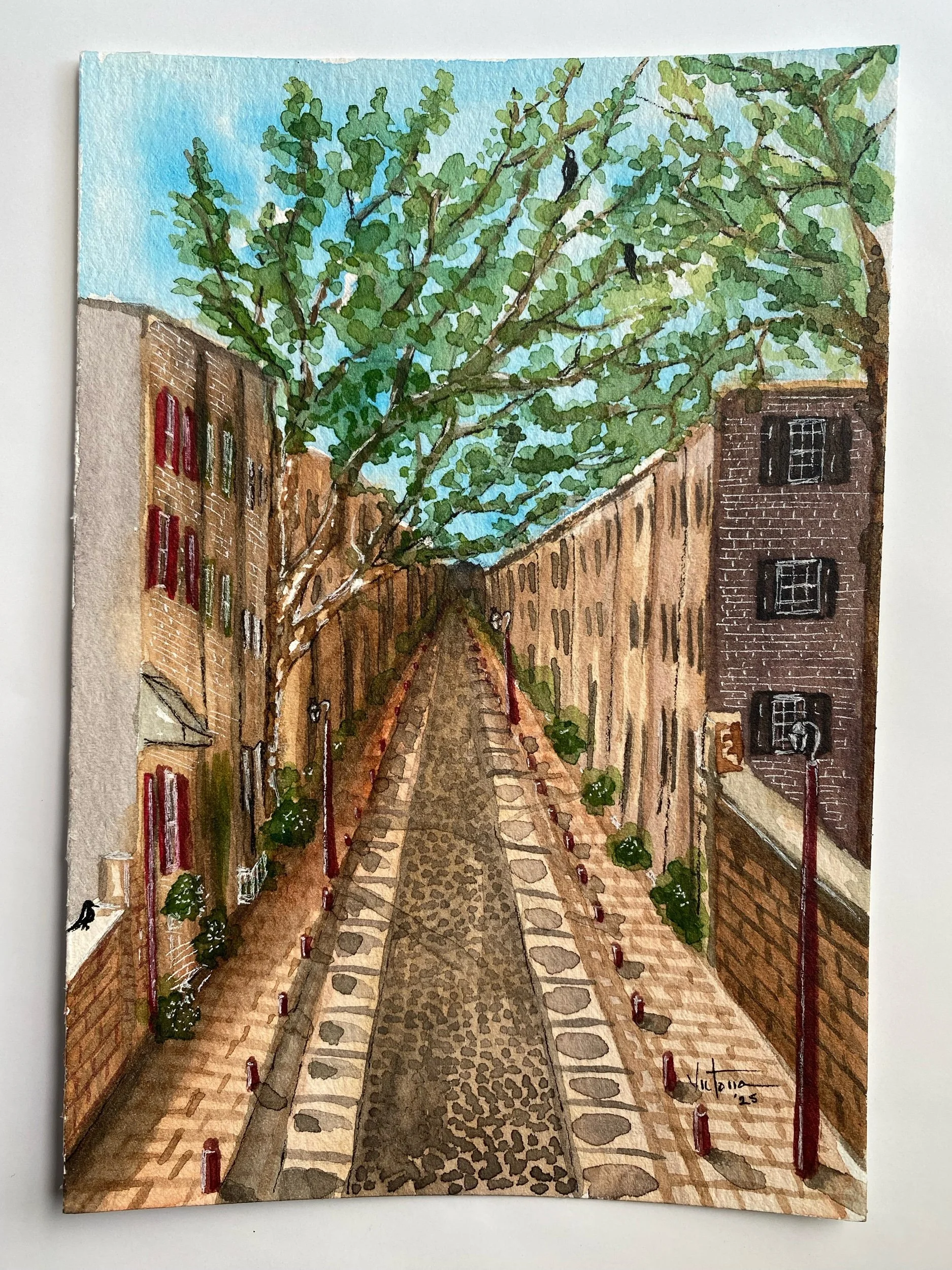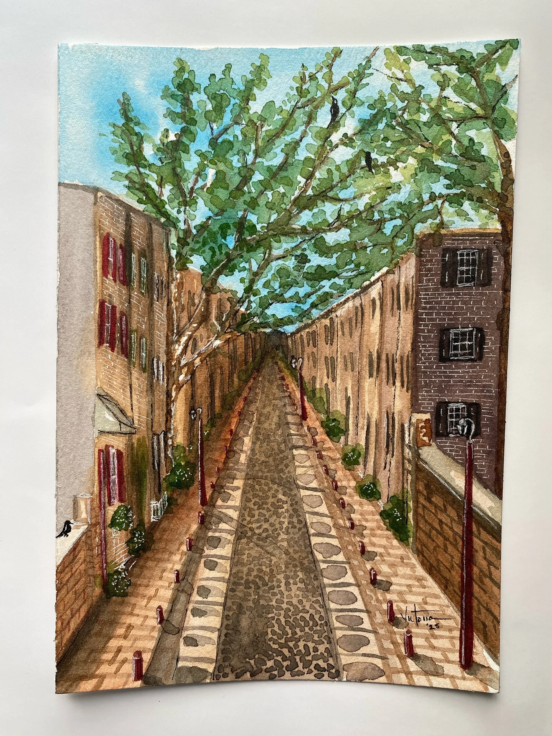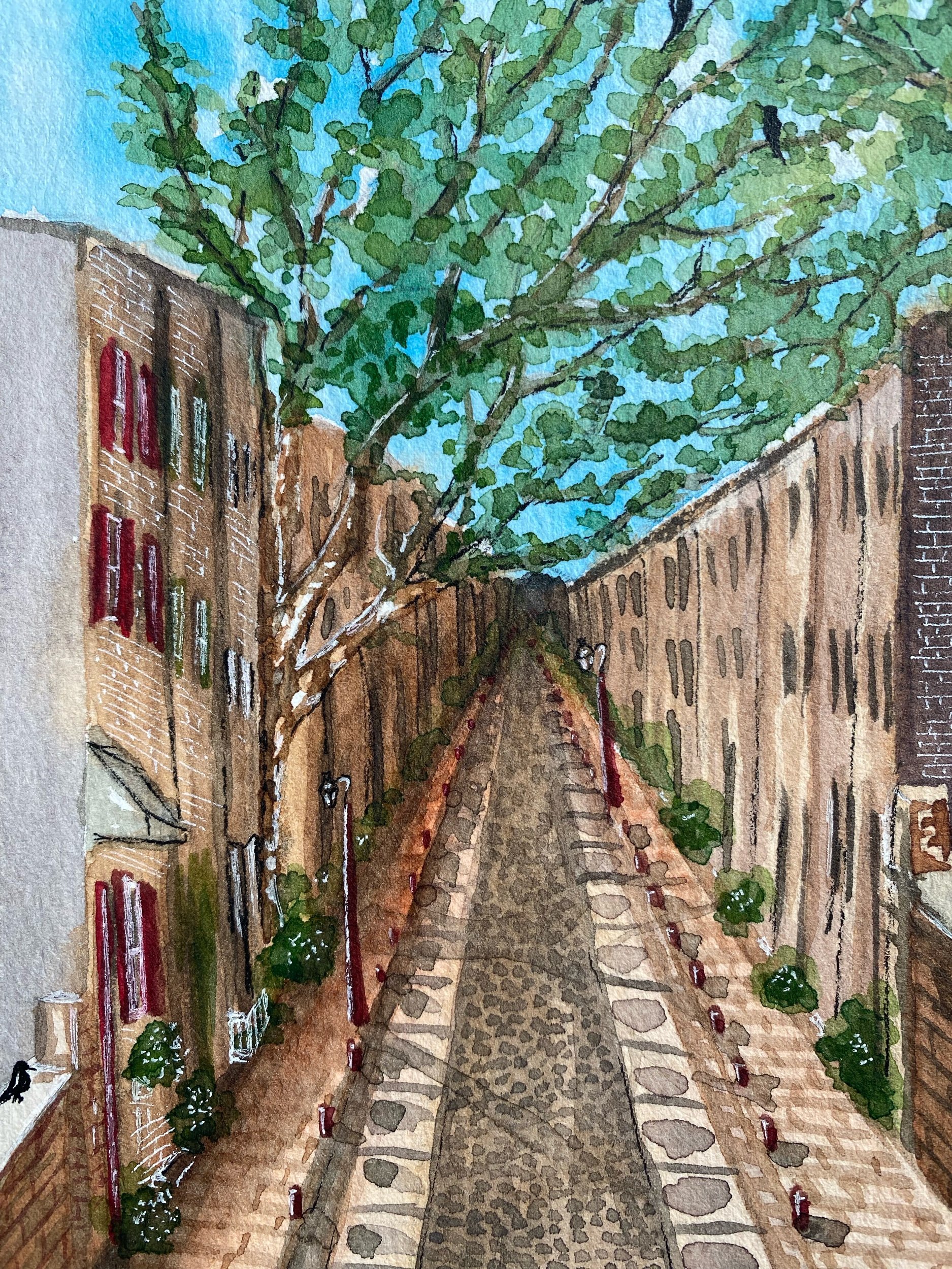 Shop › The Alley Image 1 of 5 Image 2 of 5 Image 3 of 5 Image 4 of 5 Image 5 of 5 The Alley $60.00 Sold Out Watercolor on paper 5x7in The inspiration of the Elfreth’s Alley street in summer Sold Out Added! Watercolor on paper 5x7in The inspiration of the Elfreth’s Alley street in summer