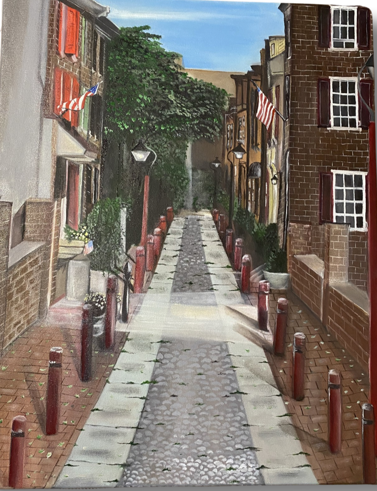 Elfreth's alley 18x24 oil on canvas one of the oldest street conserved in Philadelphia